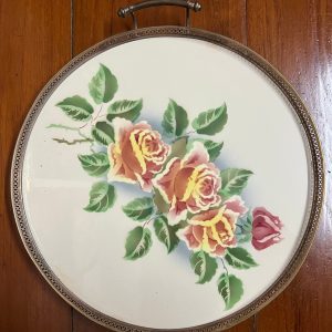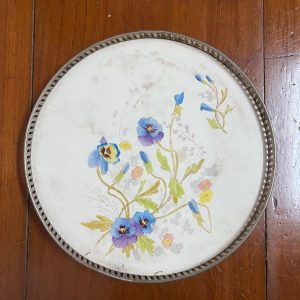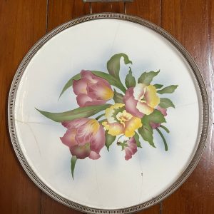 ถาดกระเบื้องโบราณสมัยร.5 ขนาด12" ปีกขอบลายถาดเจริญ ลายดอกขาวแดง 2 ดอก,ขาวน้ำเงินออกม่วง 2 ดอก สมบูรณ์สวย มีดุมขาครบ