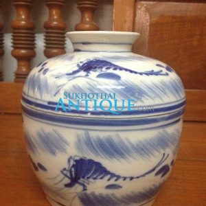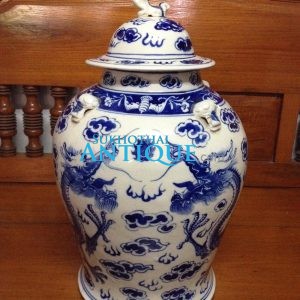 โอ่ง(โถ)กระเบื้องโบราณสีขาวลายมังกรสีฟ้ามีเล็บ 5 เล็บสองตัวกำลังเล่นลูกไฟ พร้อมฝา