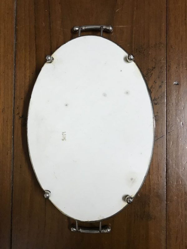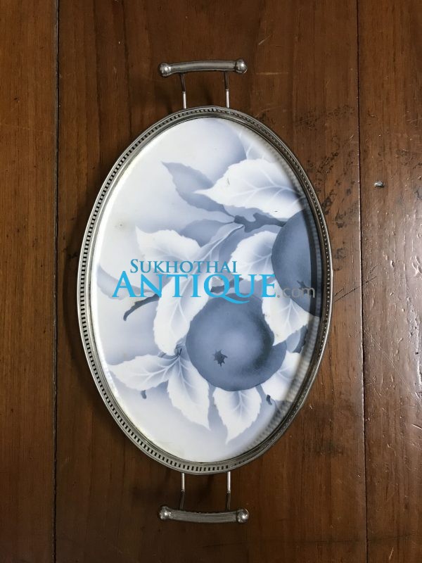 ถาดกระเบื้องโบราณรูปไข่ ลายผลไม้แบบศิลปะเทาขาว ขนาด 71/2″X13″ l4″ สวยงามสมบูรณ์