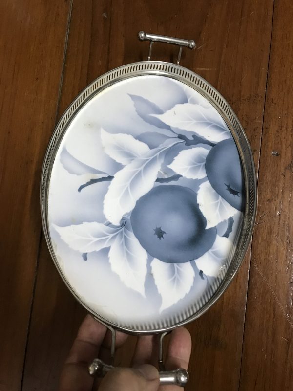 ถาดกระเบื้องโบราณแบบหายากไม่มีปีกขอบ ขนาด 12 "ลาย พวงช่อองุ่นพร้อมก้านและใบ สีขาวฟ้า จับขอบพร้อมหูและดุมขา