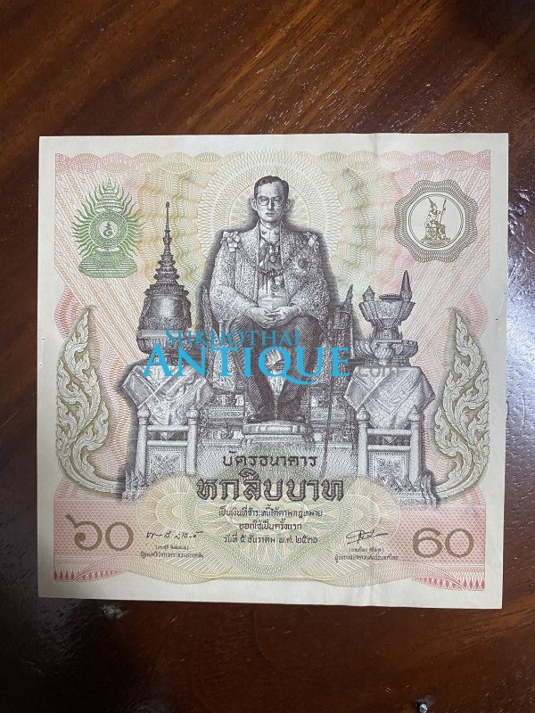 ธนบัตรธนาคารที่ระลึก ในหลวง ร.9 พระชนมพรรษาครบ 5 รอบ ออกวันที่ 5 ธันวาคม 2530 ฉบับ ราคา 60 บ.สภาพUNC
