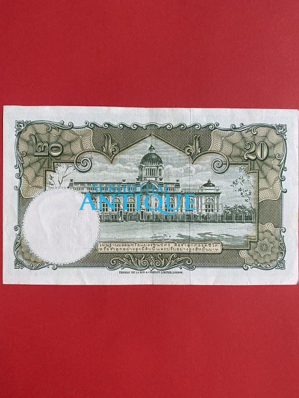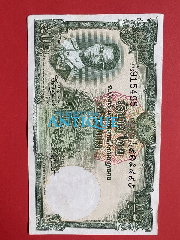 ธนบัตรแบบ 9 20 บาท รุ่นที่ 6 ประกาศใช้ 27 สิงหาคม 2501 ลายเซ็น ส.วินิจฉัยกุล – ป๋วย อึ๊งภากรณ์ พิมพ์ บริษัท โทมัส เดอ ลา ลู