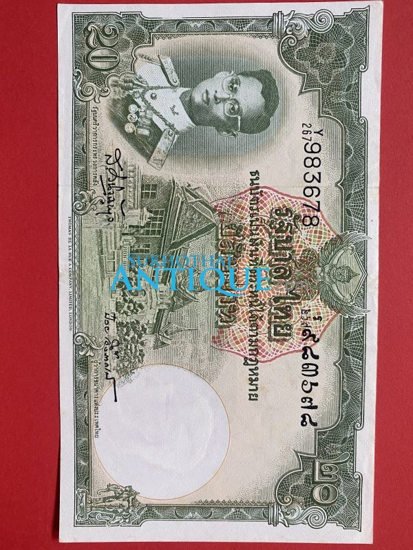 ธนบัตรแบบ 9 20 บาท รุ่นที่ 6 ประกาศใช้ 27 สิงหาคม 2501 ลายเซ็น ส.วินิจฉัยกุล – ป๋วย อึ๊งภากรณ์ พิมพ์ บริษัท โทมัส เดอ ลา ลู