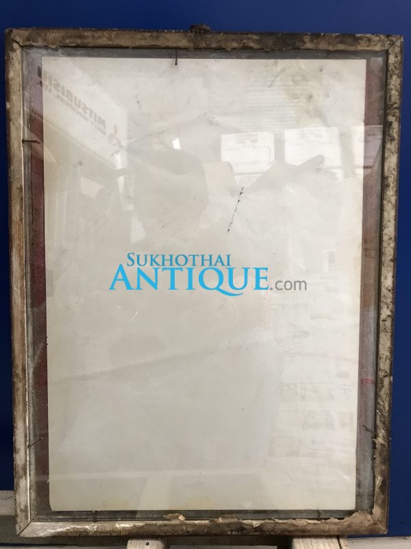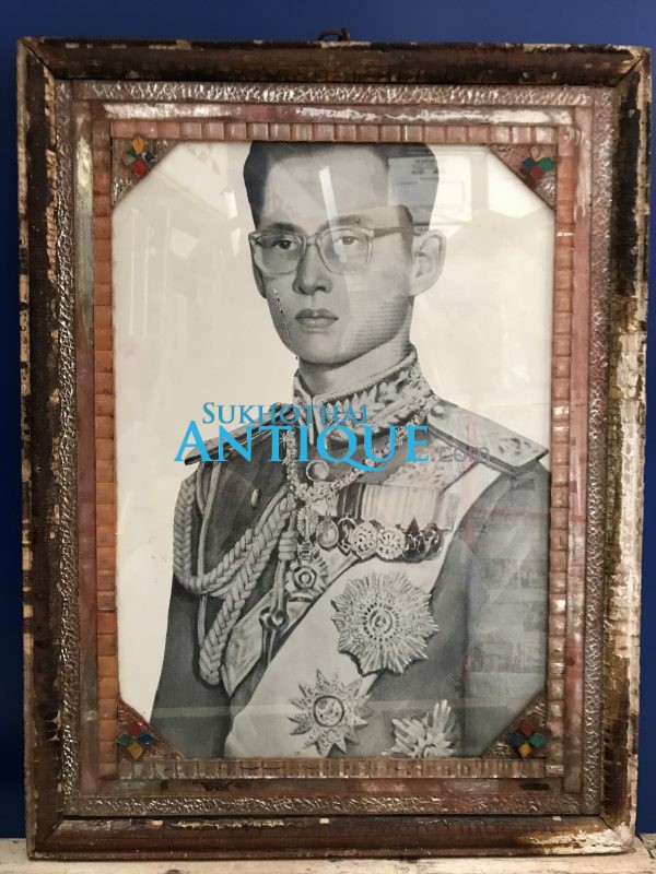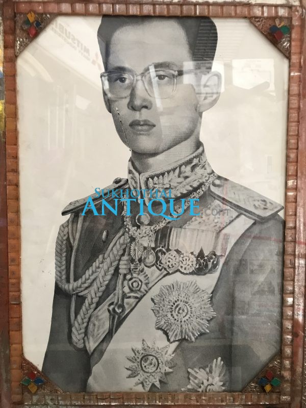 รูปถ่ายในหลวงขาวดำทรงชุดจอมทัพอยู่ในกรอบไม้เก่า ขนาด 13″X17 1/2″ สมบูรณ์สวยงามคลาสสืก