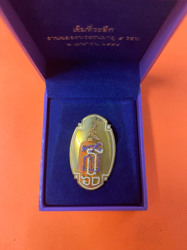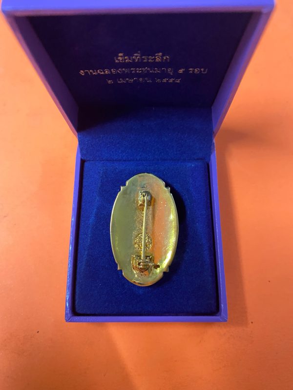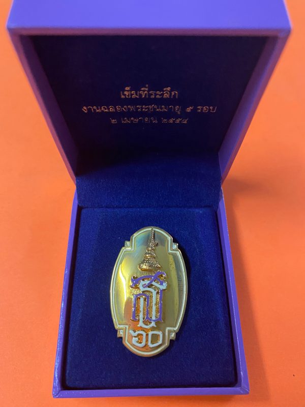 เข็มที่ระลึก รุ่นฉลองพระชนมายุ 5 รอบ 2 เมษายน 2558 อยู่ในกล่องกำมะหยี่พร้อมกล่องเดิมสีม่วงมีตราสัญญาลักษณ์ สธ.