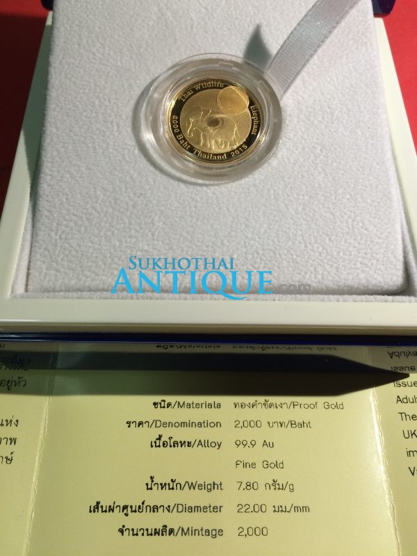 เหรียญกษาปณ์ที่ระลึก “ช้างไทย”เนื้อทองคำขัดเงา 99.99% ผลิตจากประเทศ อังกฤษ สผ.22.มม.หนัก 7.80 g ปี 2015 ราคา 2,000 บ.