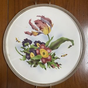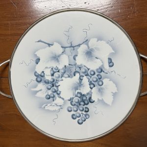 ถาดกระเบื้องโบราณแบบหายากไม่มีปีกขอบ ขนาด 12 "ลาย พวงช่อองุ่นพร้อมก้านและใบ สีขาวฟ้า จับขอบพร้อมหูและดุมขา