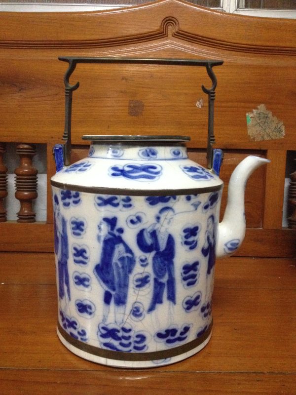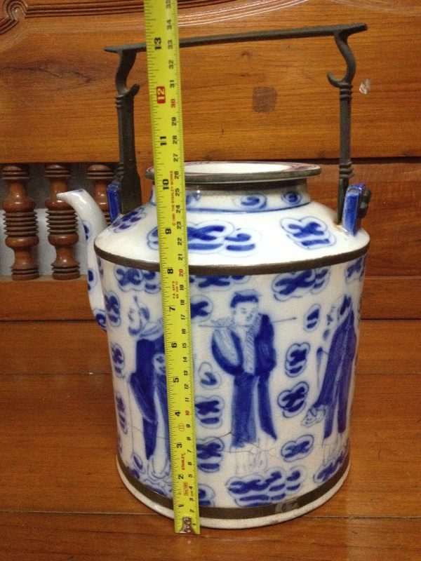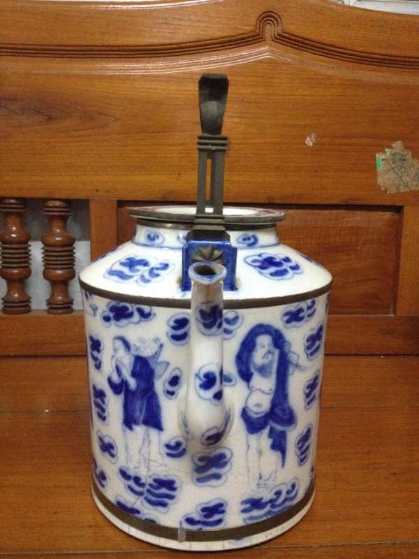 กาน้ำชาโบราณลายแปดเซียน พร้อมหูหิ้วและฝา สูงประมาณ 10 ” ใหญ่มากมีรอยร้าวเดิมๆไม่ได้ผ่านการซ่อมแซม หายากมากๆ