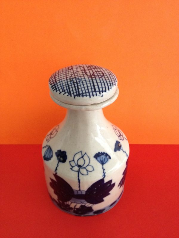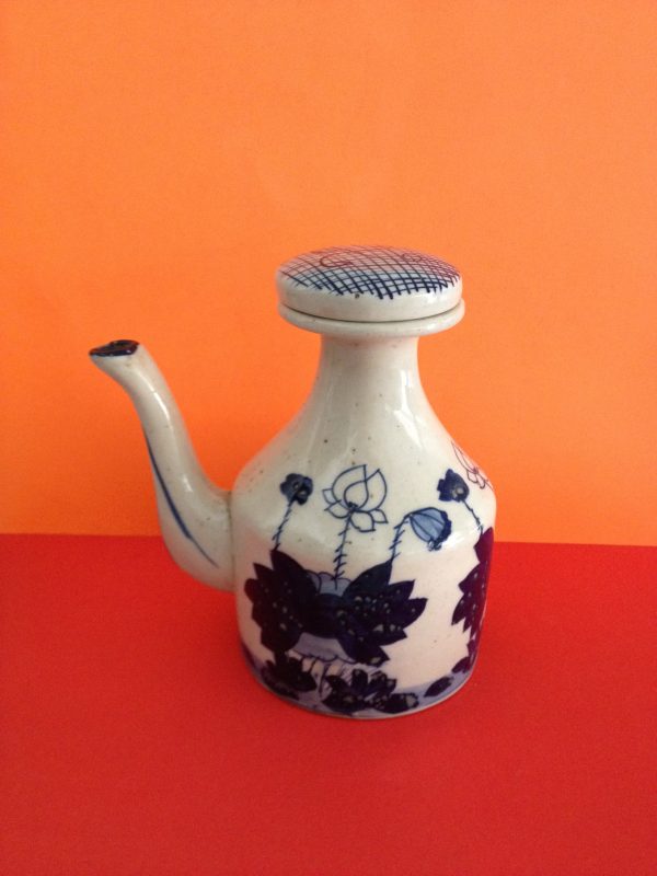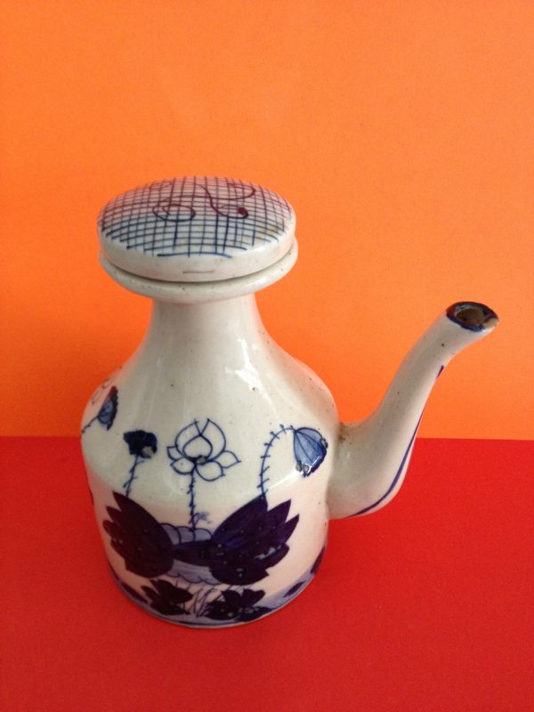 กาน้ำใบเล็กสีฟ้าขาวลายกอบัวมีฝาเป็นจุกกระเบื้ง