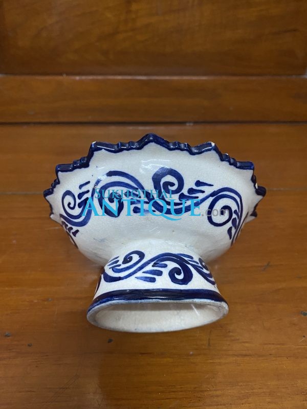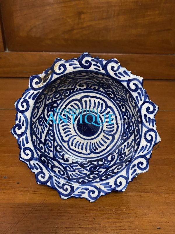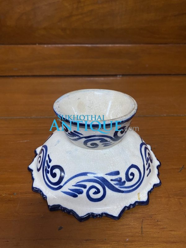 จานเชิงเก่าสมัยรัตนโกสิทร์ใบสีขาวลวดลายสีนำ้เงินโดยรอบทั้งบนและล่าง