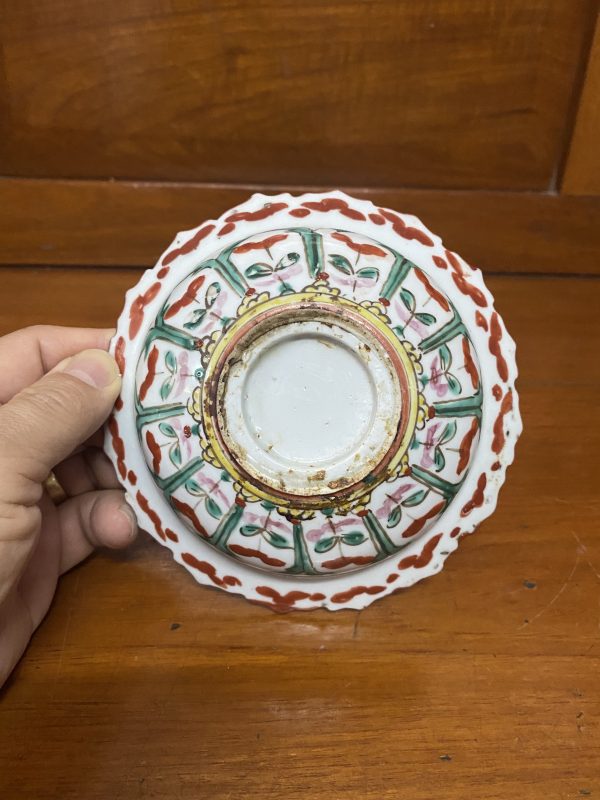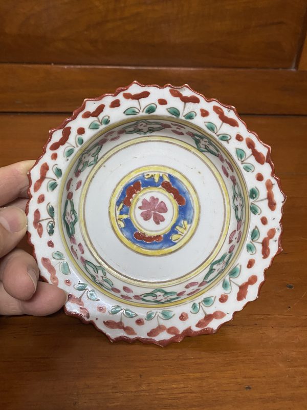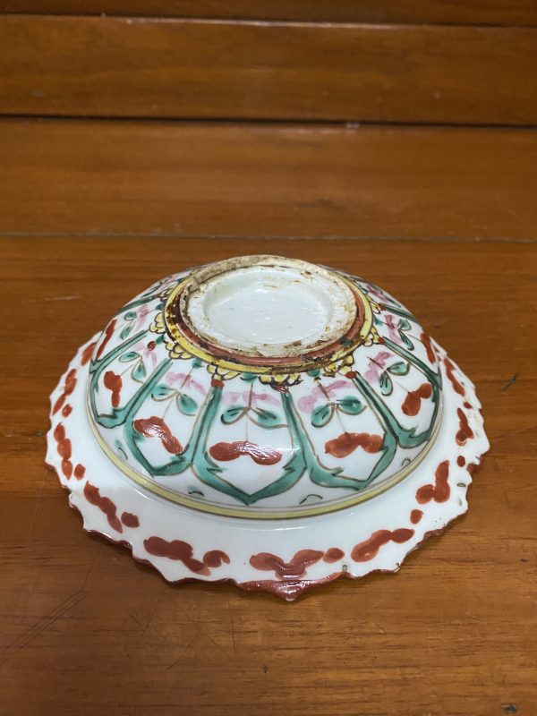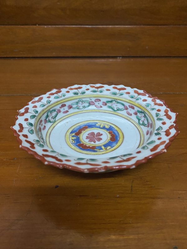 จานเชิงเก่าสมัยรัตนโกสิทร์ตอนต้นใบสีขาวลวดลายสีแดงเขียวเหลืองและสีนำ้เงินโดยรอบทั้งบนและล่าง (ฐานหลุดหายน่าจะเกิดจากทานำ้สลิปไม่ดีแล้วนำไปเผา)