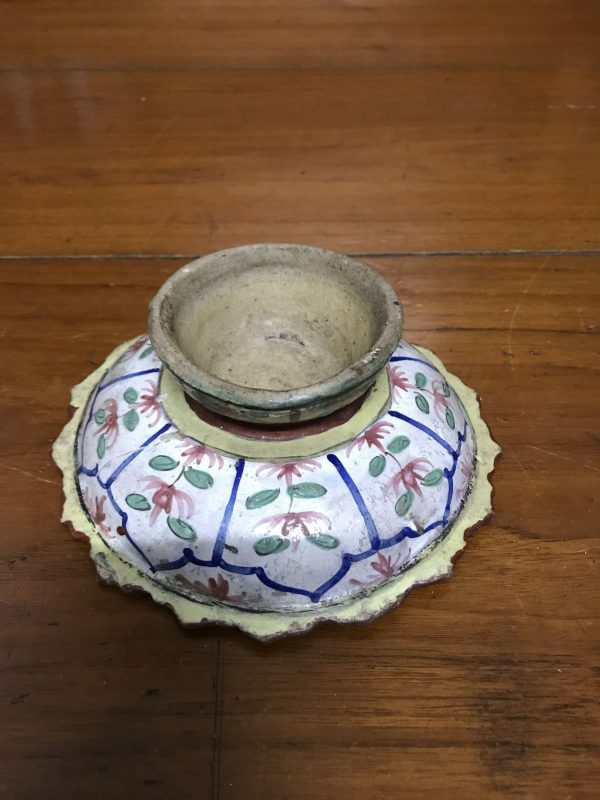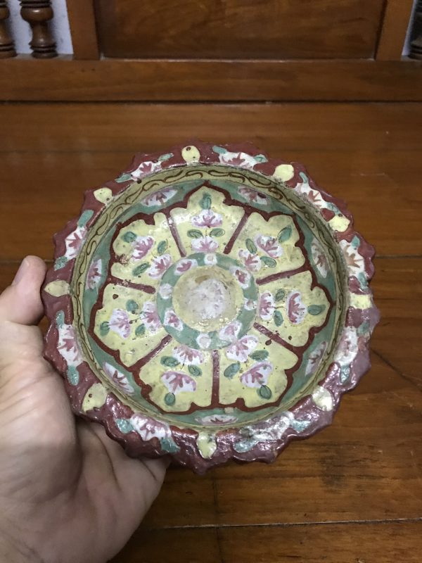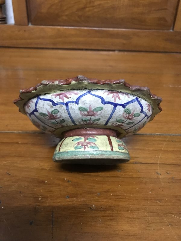 จานเชิงโบราณสมัยอยุธยา ขนาดเส้นผ่่าศูนย์กลาง 8″ สูง 3 1/2″ สีเหลือง เขียว และแดง