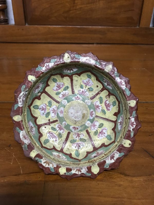 จานเชิงโบราณสมัยอยุธยา ขนาดเส้นผ่่าศูนย์กลาง 8″ สูง 3 1/2″ สีเหลือง เขียว และแดง