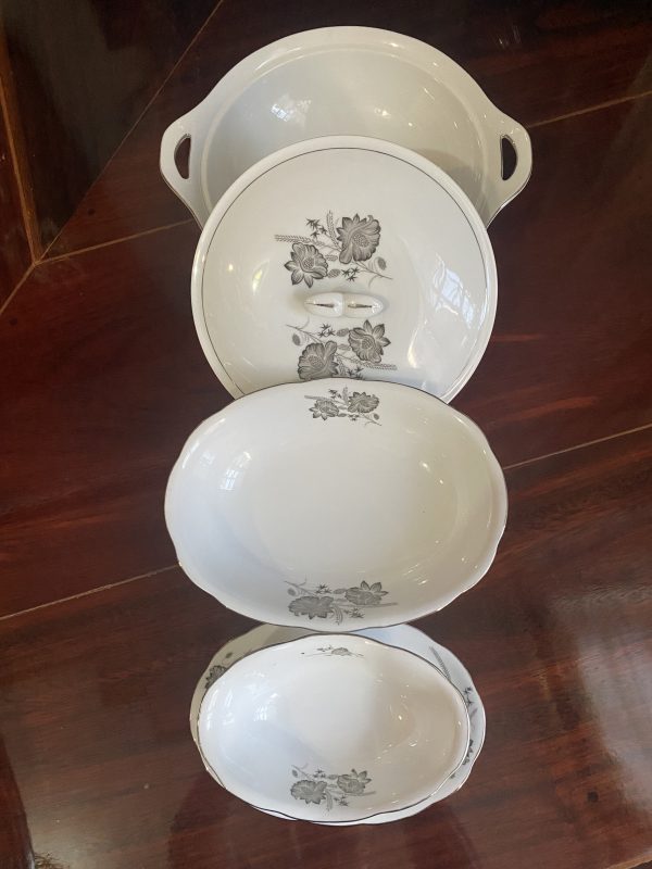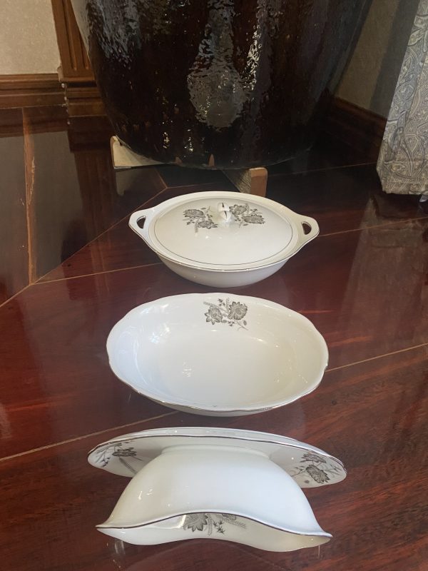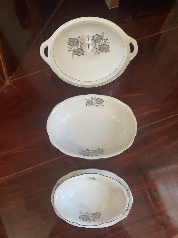 ชามใส่นำ้แกงและใส่ข้าวเก่าเก็บเนื้อกระเบื้องเกรด A นำเข้าจากต่างประเทศ ลายดอกไม้ขลิบเงิน มีใบใหญ่พร้อมฝา 1 ใบ กลาง 1 ใบ และเล็กก้นติด 1 ใบสวยงามหายาก