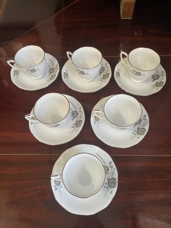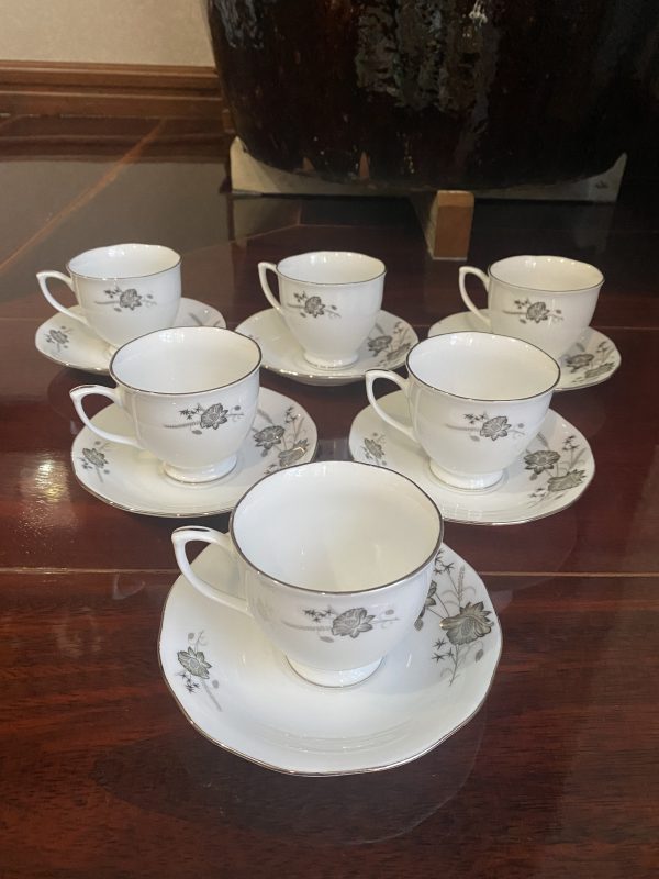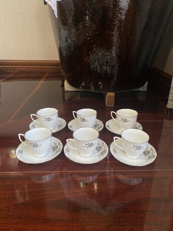 ชุดถ้วยกาแฟเก่าเก็บพร้อมจานลอง เกรด A นำเข้าจากต่างประเทศ ลายดอกไม้ขลิบเงิน สวยงามประณีต รวม 6 ชุด