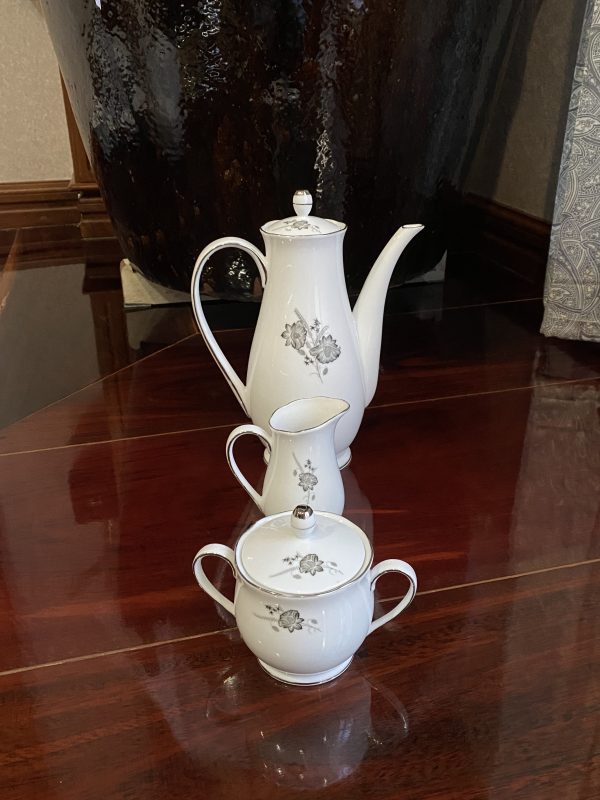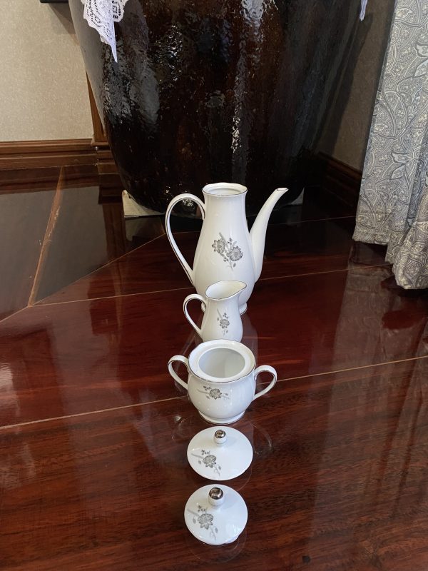 ชุดเหยือกนำ้ชา นำ้ และนม เก่าเก็บ เกรด A นำเข้าจากต่างประเทศ ลายดอกไม้ขลิบเงิน สวยงามประณีต ใบใหญ่สูงประมาณ 12″