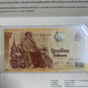 พิมพ์โรงพิมพ์ธนบัตรไทย ออกใช้ 9 มิถุนายน 2549 หมวด 9 ธ 7363507 ( 9,999,999 ฉบับ ) ฉบับ 60 บาท