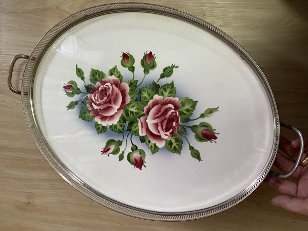 ถาดกระเบื้องเก่ารูปไข่สมัยร.5 ผลิตจากต่างประเทศลายดอกกุหลาบสีแดงขาวบานใหญ่ 2 ดอก,ตูม 12 ดอก ขนาด 18″ร้าว1เส้นบางมาก