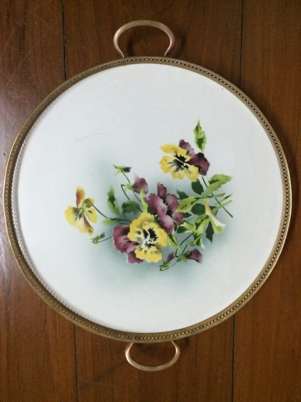 ถาดกระเบื้องโบราญสมัย ร.5 ขนาด สผ.16″ผลิตในประเทศเยอรมัน ลายดอกไม้บานสีเหลือง 3 และม่วง 3 มีรอยขีดเล็กน้อย นอกนั้นทุกอย่างสภาพสมบูรณ์สวยงามคลาสสิก