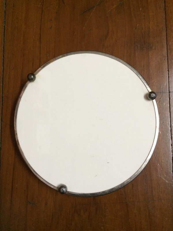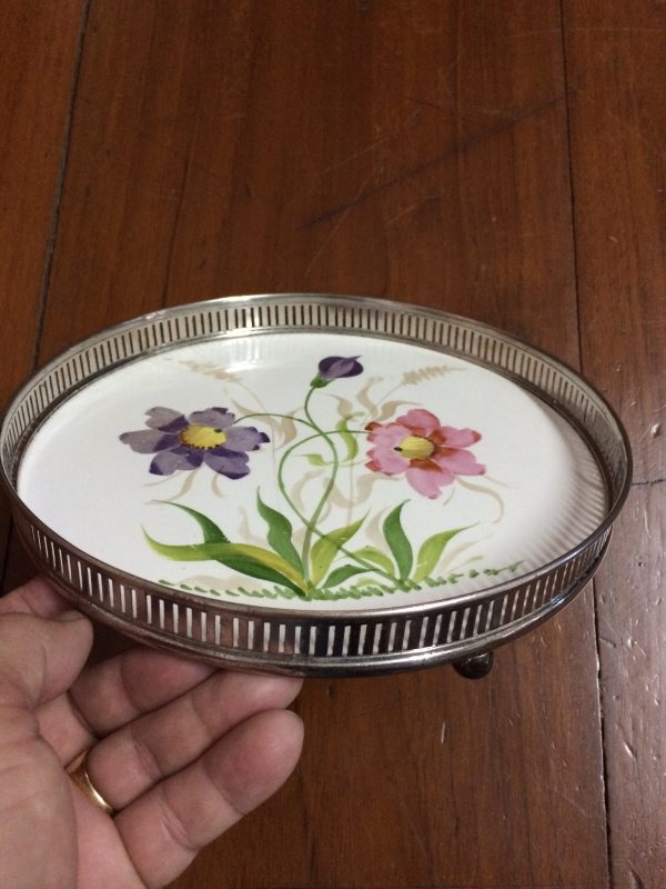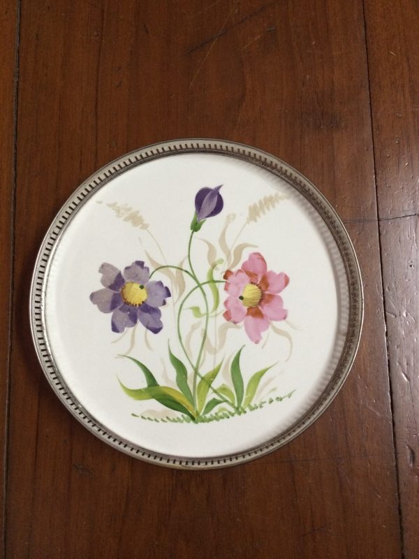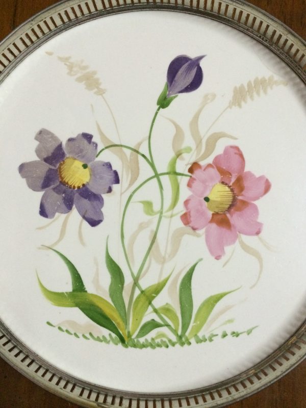 ถาดกระเบื้องโบราญสมัย ร.5 ขนาด สผ.8″ลายดอกไม้สีม่วง 2 ชมพู 1 สภาพสวยงามคลาสสิกครบสมบูรณ์