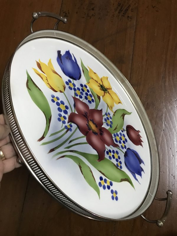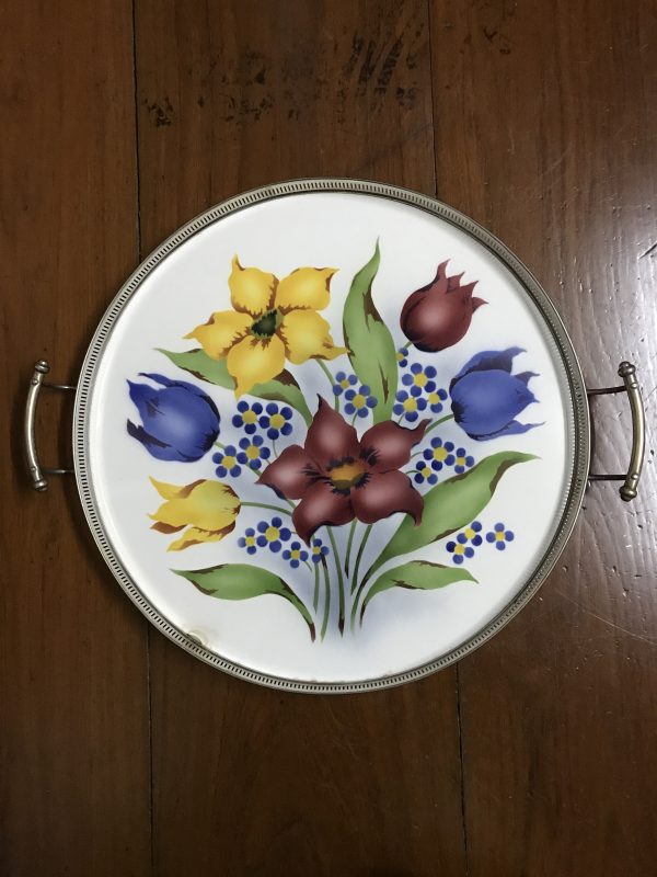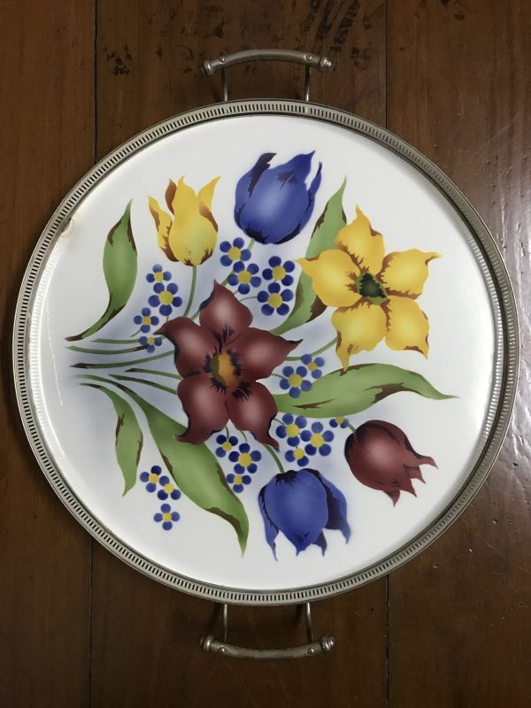 ถาดกระเบื้องโบราณกลมขนาด สผ 16″ ลายช่อดอกสีสดเต็ม เหลือง 2 แดง 2 และนำ้เงิน 2 สภาพสมบูรณ์สวยงามมากๆ