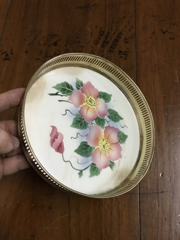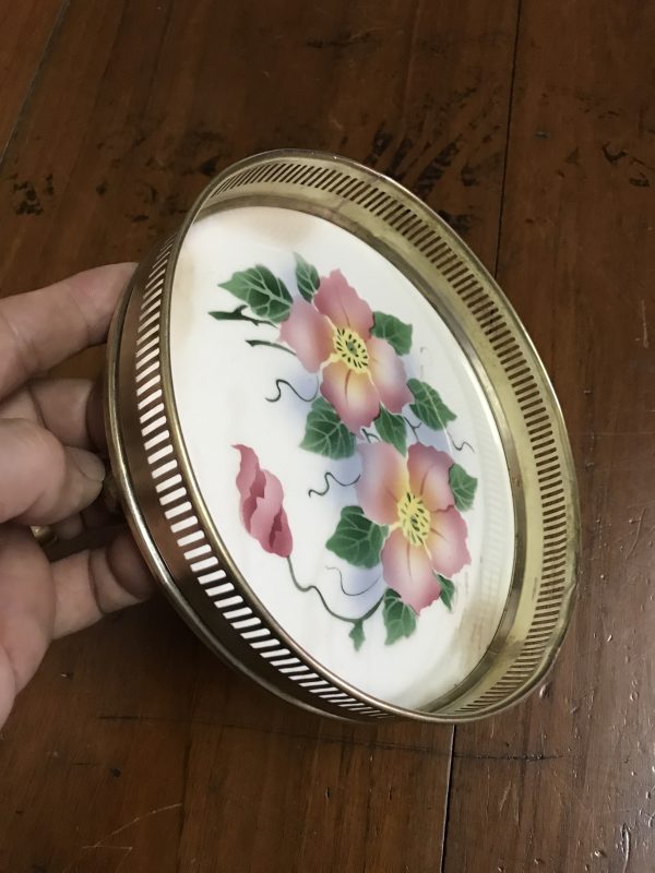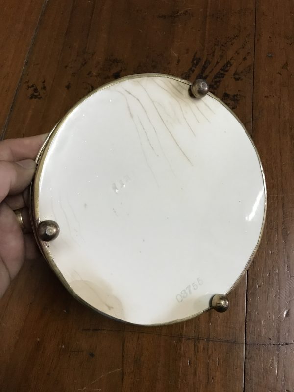 ถาดกระเบื้องโบราณกลมขนาด สผ. 6″ ลายดอกสีชมพูบาน 2 ดอกตูม 1 ดอก มีรานเล็กน้อย