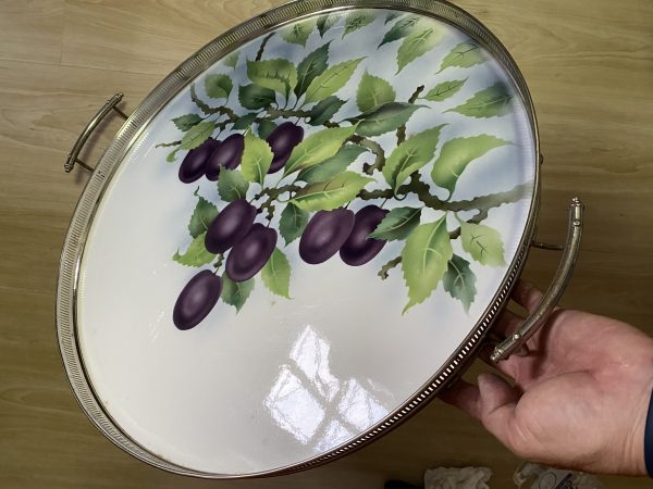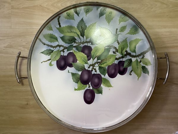 ถาดกระเบื้องโบราณกลม สมัยร.5 ลวดลายช่อองุ่น 8 ผลสีม่วงพร้อมใบและกิ่งก้านกระเบื้องและขอบขาlสภาพสมบูรณ์มากๆ