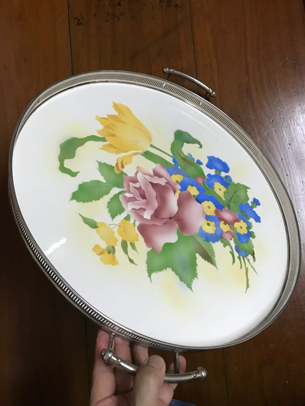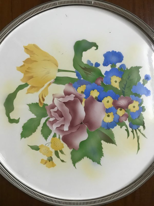ถาดกระเบื้องโบราณขนาด สผ 18″ ลายดอกกุหลาบสีชมพูใหญ่ 1 ดอกทิวลิปเหลือง 1 ดอกและรวมช่อนำ้เงินเหลืองสมบูรณ์สวยงามมากๆ