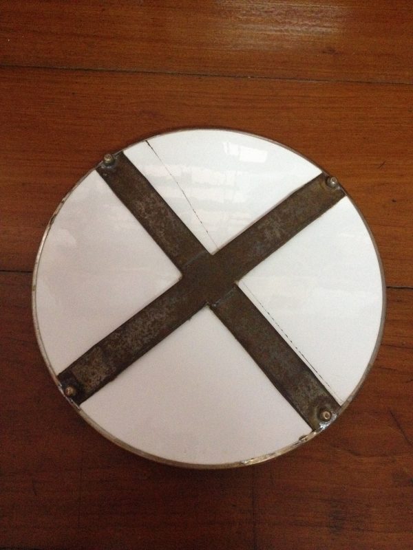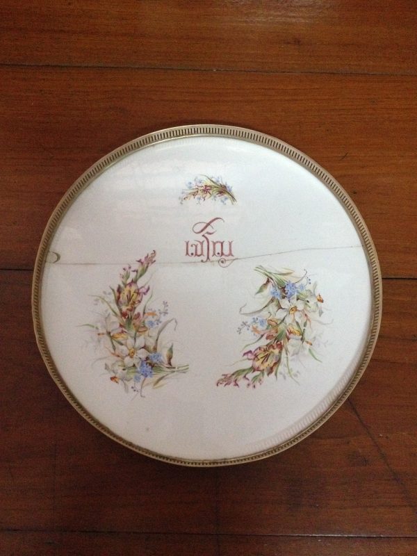 ถาดกระเบื้องโบราณขนาด 13.5″ลาย ” เจริญ ” สไตล์ วิคตอเรีย ใหญ่ขนาดนี้หายากมาก (ด้านหลังมีเหล็กคาดพร้อมดุมครบ)