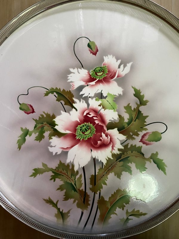 ถาดกระเบื้องโบราณสมัยร .5 ขนาด สผ 16" สไตล์”วิคตอเรีย”ลายดอกเต็มสีชมพูบาน 2 ดอกตูม 2 ดอกนำ้เงิน 3 ดอก