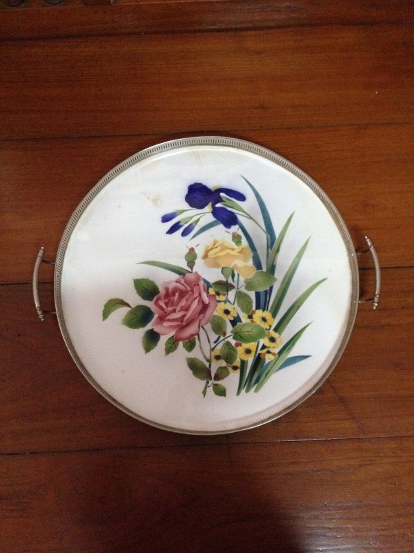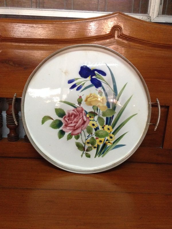 ถาดกระเบื้องโบราณขนาด 18 ” ลายดอกกุหลาบสีแดง สีเหลือง สวยงาม สมบูรณ์มากๆสภาพนี้ ใบที่ 1