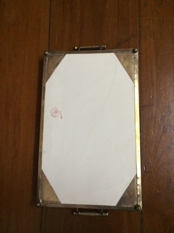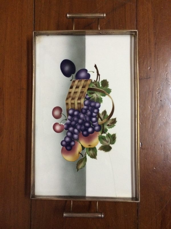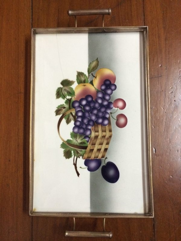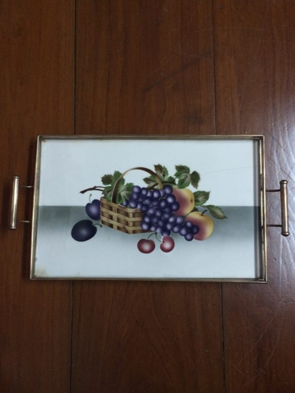 ถาดกระเบื้องโบราณรูปสี่เหลี่ยมกว้าง 9 1/2″X15″ ลายผลไม้องุ่น เชอรี่ ส้มและอื่นๆหลากหลายอยู่ในตระกร้า