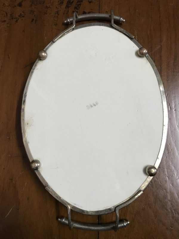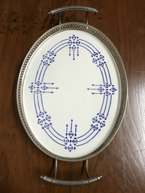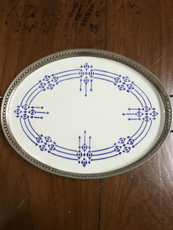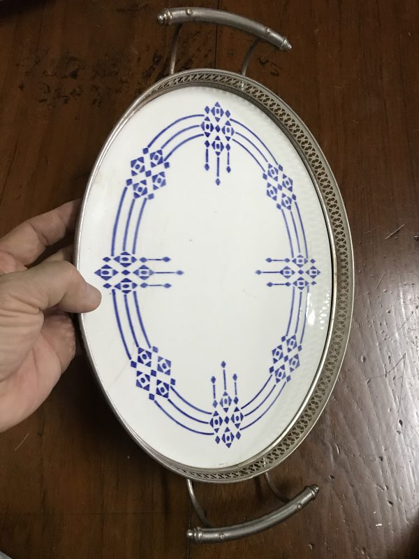 ถาดกระเบื้องโบราณรูปไข่ขนาด 8″X11″ ลายศิลปะร่วมสมัย พื้นขาวลายสีนำ้เงิน สภาพค่อนข้างสมบูรณ์และสวยงามหายากมากๆ