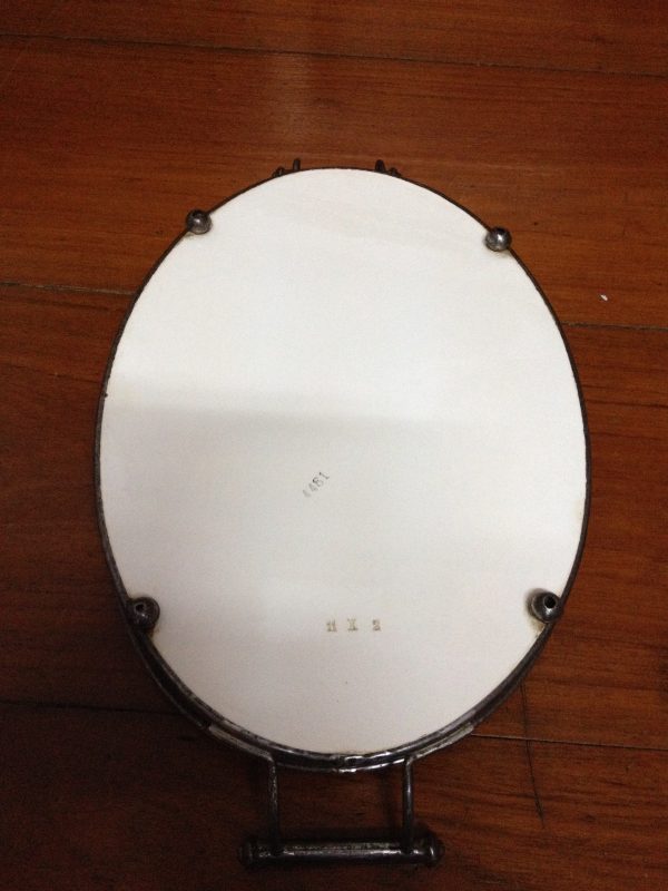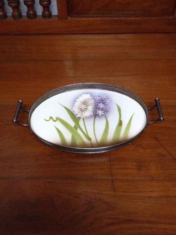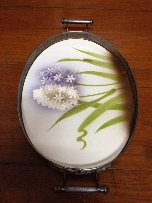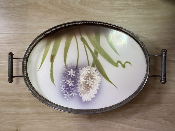 ถาดกระเบื้องโบราณรูปไข่ขนาด 10″x14″ลายดอกไม้ป่าสีขาวกับสีม่วง หายากสมบูรณ์สวยงามมากๆไม่มีซ่อม(มีหู,มีดุมขาครบ)