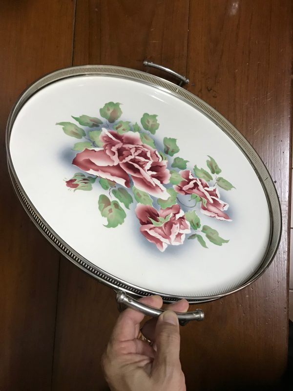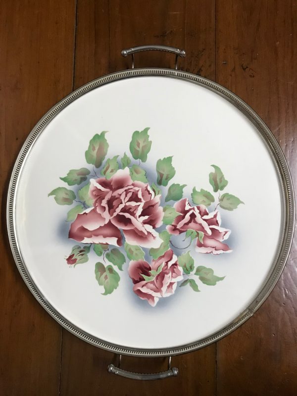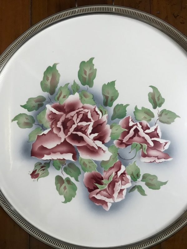 ถาดกระเบื้องโบราณสมัย ร.5 ขนาดสผ.18″ลายช่อดอกกุหลาบสีชมพูอมขาวบาน 3 ดอก ตูม1 ดอก สายงามสมบูรณ์มากๆ