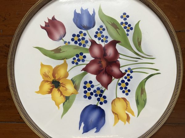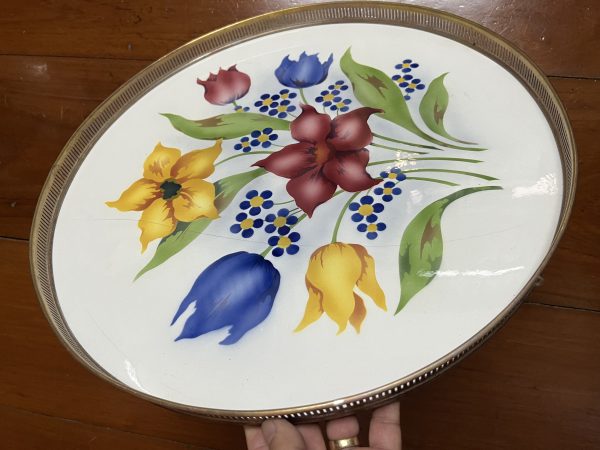 ถาดกระเบื้องโบราณสมัย ร.5 ขนาด 18″ ลายช่อดอกเต็มมีสีเหลืองชมพูและฟ้าอย่างละ 2 ดอก มีรอยร้าว 1 เส้น ขาดดุมและหู