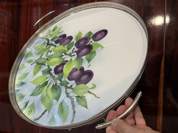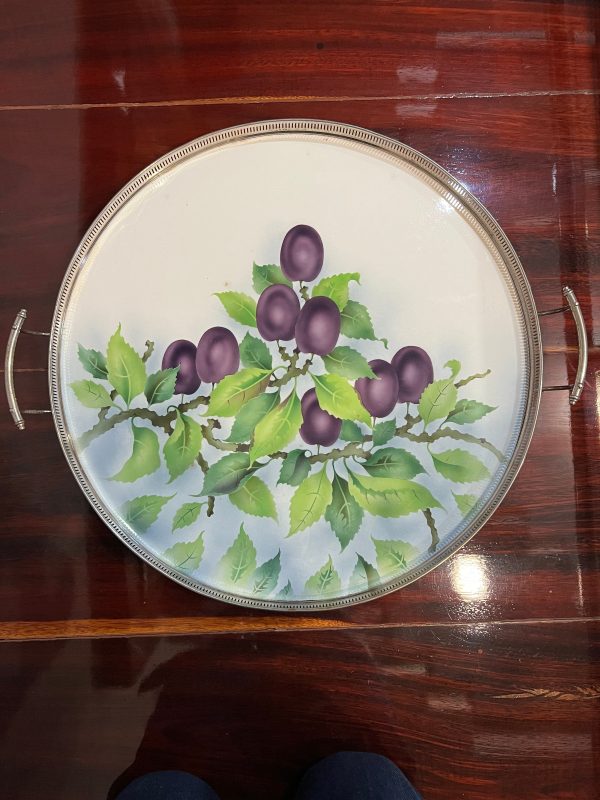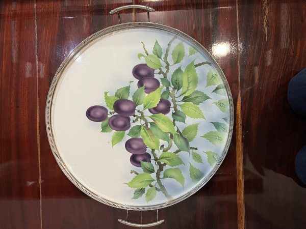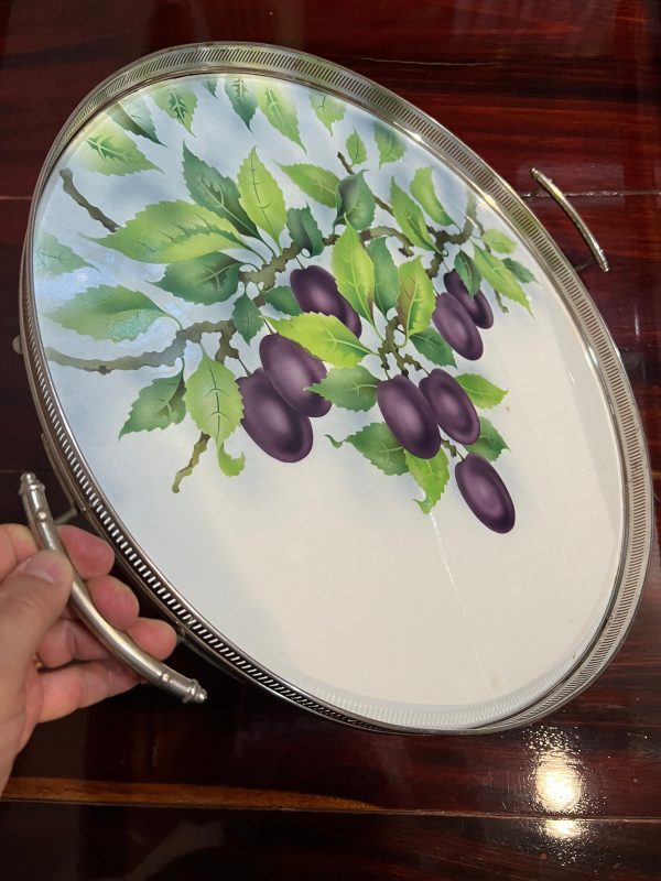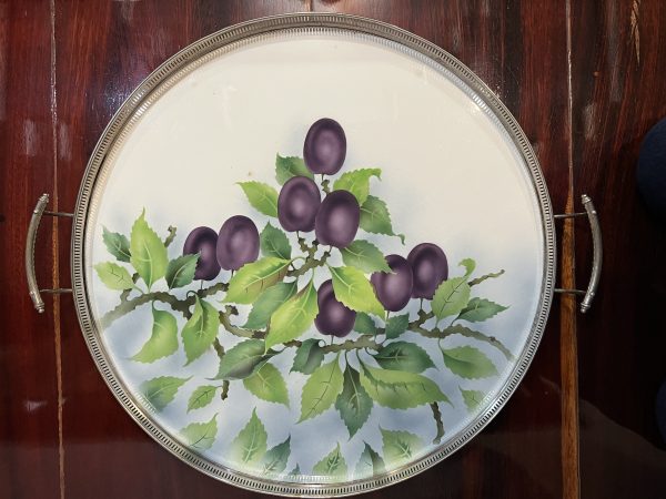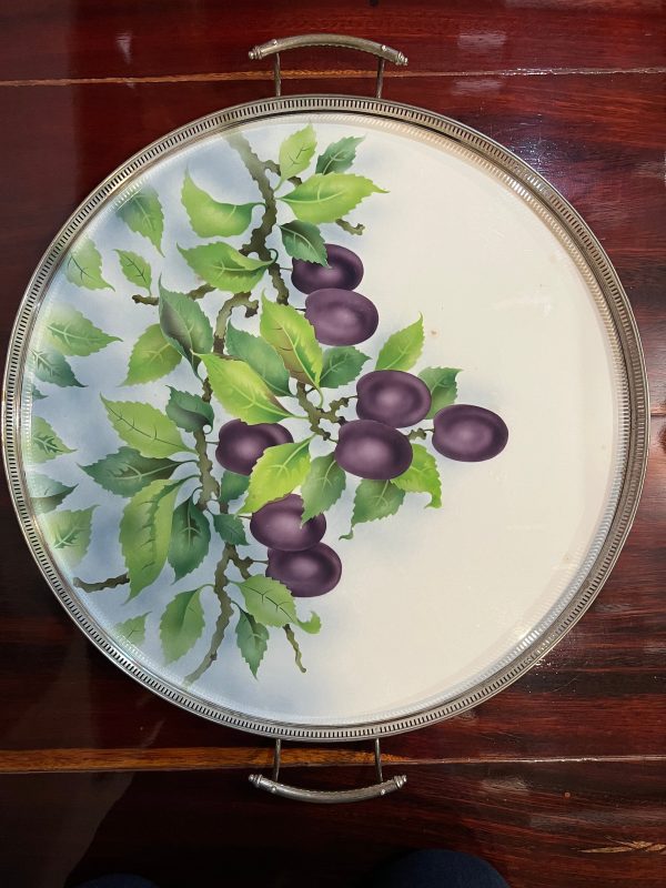 ถาดกระเบื้องโบราณสมัย ร.5 ขนาดใหญ่ 20″ ผลิตจากต่างประเทศ ลายช่อผลไม้เชอรี่สีม่วง 8 ผล สภาพสวยสมบูรณ์แบบนี้หายากมาก