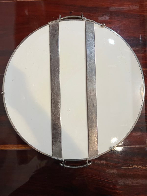 ถาดกระเบื้องโบราณแบบหายากไม่มีปีกขอบ ขนาด 12 "ลาย พวงช่อองุ่นพร้อมก้านและใบ สีขาวฟ้า จับขอบพร้อมหูและดุมขา