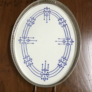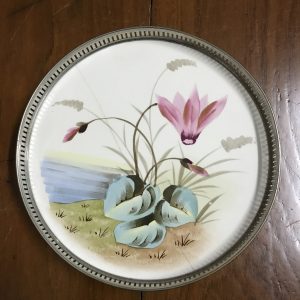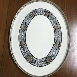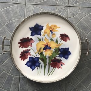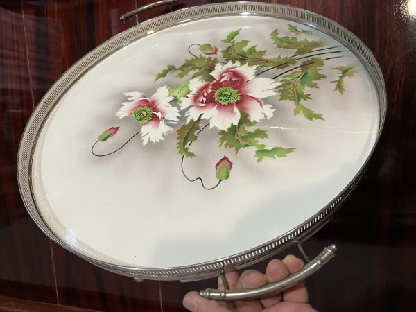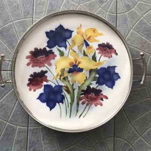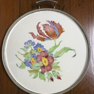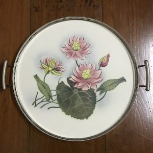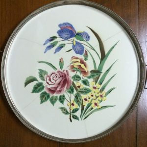 ถาดกระเบื้องโบราณสมัย ร. 5 ผลิตจากต่างประเทศขนาดใหญ่ 20″ ลายช่อดอกไม้สีนํ้าตาลขาว ตูมสามดอกและบานสองดอก สวยสมบูรณ์