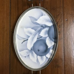 ถาดกระเบื้องโบราณแบบหายากไม่มีปีกขอบ ขนาด 12 "ลาย พวงช่อองุ่นพร้อมก้านและใบ สีขาวฟ้า จับขอบพร้อมหูและดุมขา