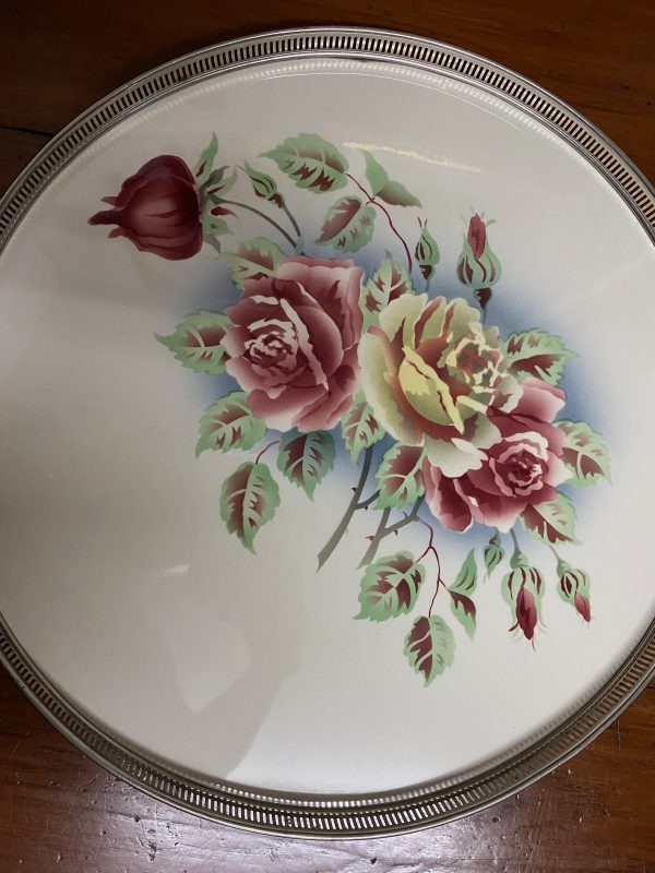 ถาดกระเบื้องโบราณสมัย ร.5 สผ. 16″ ลายช่อดอกกุหลาบ 9 ดอก ตูม 6 ดอก บาน 3 ชมพู 2 อมเหลือง 1 สวยสมบูรณ์สุดๆมีสติกเกอร์เดิม