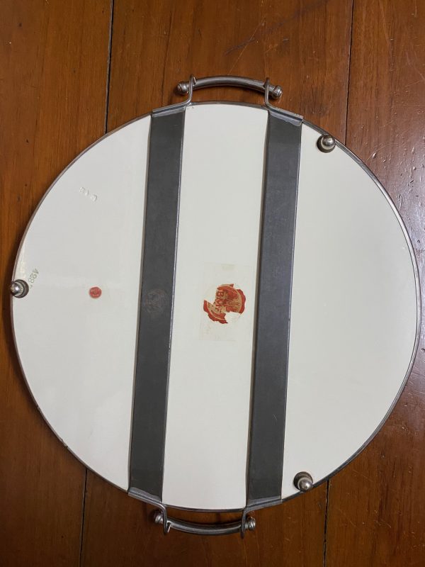 ถาดกระเบื้องโบราณแบบหายากไม่มีปีกขอบ ขนาด 12 "ลาย พวงช่อองุ่นพร้อมก้านและใบ สีขาวฟ้า จับขอบพร้อมหูและดุมขา