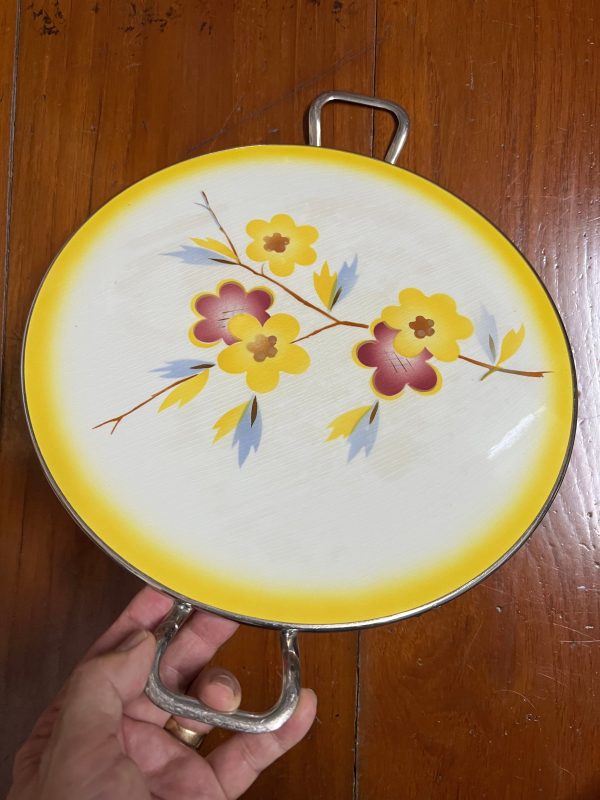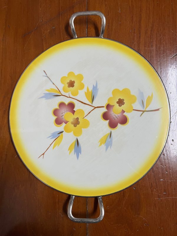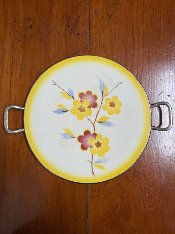 ถาดกระเบื้องโบราณแบบหายากไม่มีปีกขอบ ขนาด 12 “ลาย ช่อดอกไม้สีส้ม 3 ดอกและนำ้ตาล 2 ดอก จับขอบพร้อมหูและดุมขา สมบูรณ์