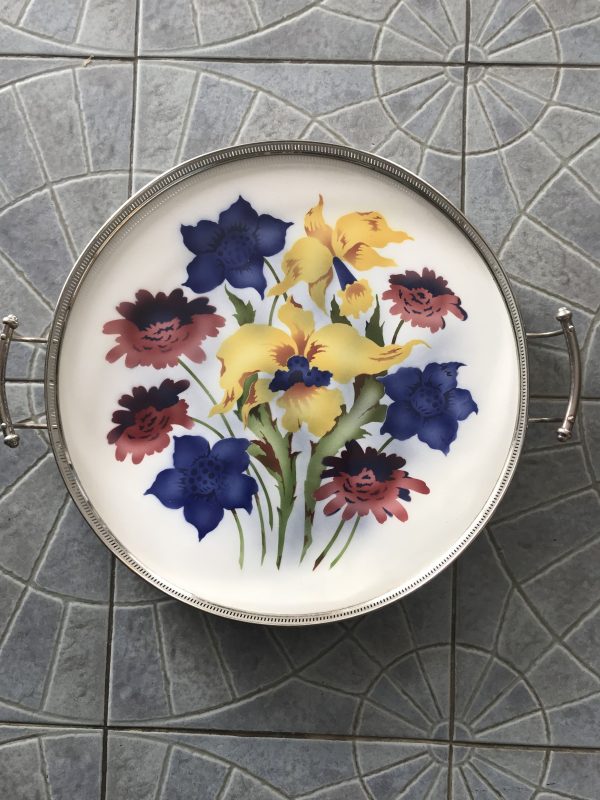 ถาดกระเบื้องโบราณ ขนาด 18 นิ้ว ลายดอกกุหลาบบานแดง 1 เหลือง 1 นอกนั้นดอกอื่นๆ เหลือง 7 ดอก