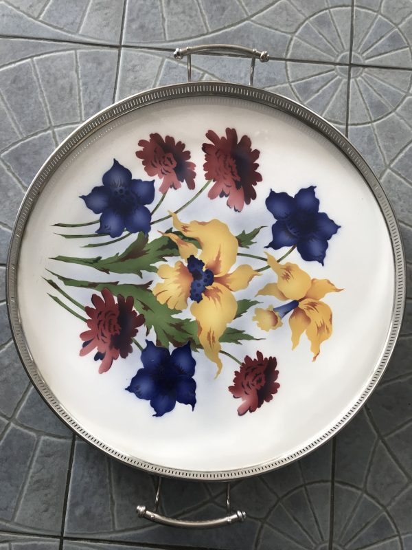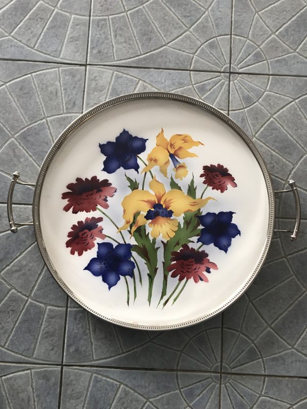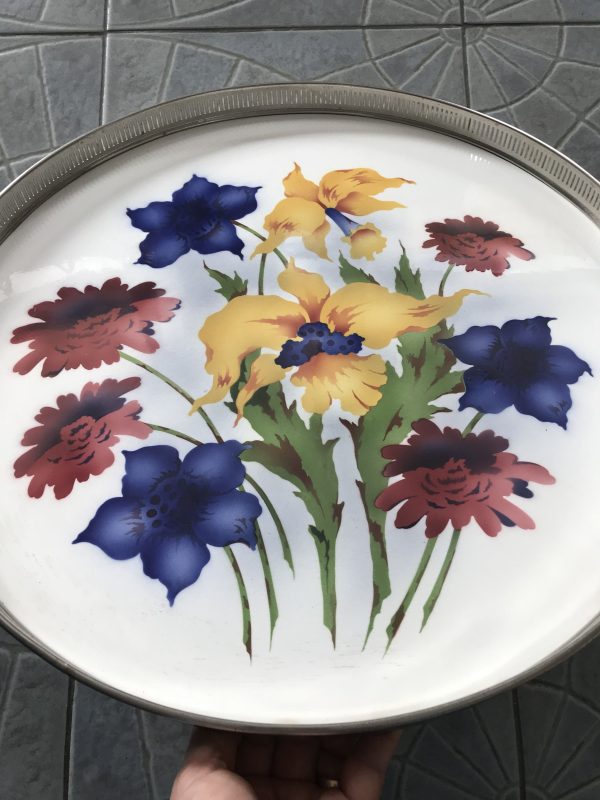 ถาดกระเบื้องโบราณ ขนาด 18 นิ้ว ลายดอกกุหลาบบานแดง 1 เหลือง 1 นอกนั้นดอกอื่นๆ เหลือง 7 ดอก