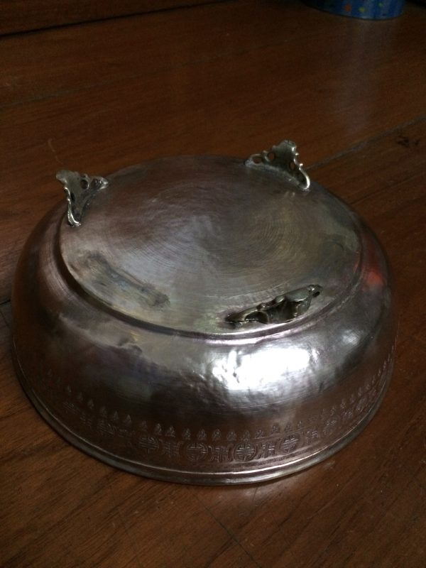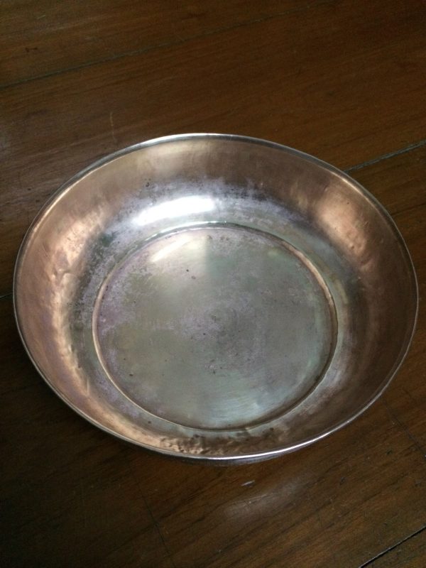 ถาดเก่าทองเหลืองอมนาก มีตอกลวดลายที่ข้างถาด สผ.ประมาณ.8″