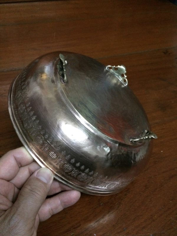 ตลับทองเหลืองจีนโบราณ มีแกะสลักลวดลายรูปและภาษาจีน โดยรอบสวยงามสมบูรณ์