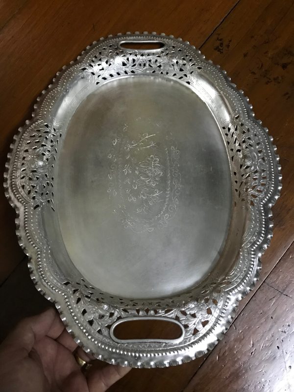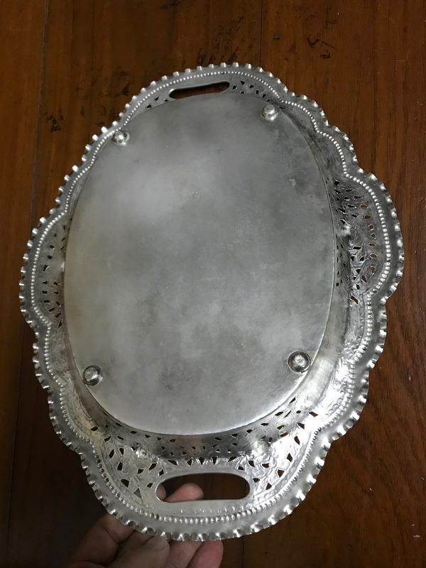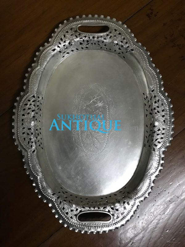 ถาดใส่ผลไม้รูปไข่ เนื้อเงิน มีลายฉลุโดยรอบ มีขา 4 ขา นำ้หนัก 697 กรัม (45.8บาท) สมบูรณ์ สวยงามมาก