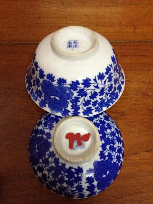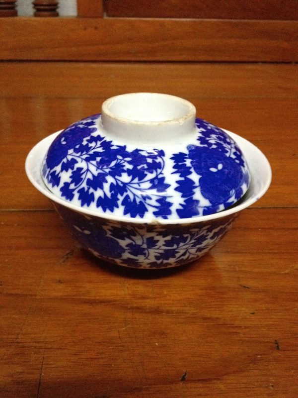 ถ้วยจีนเก่าโบราณพร้อมฝาสีขาวฟ้า ที่ก้นถ้ายและที่จุกฝามีภาษาจีน4ตัว