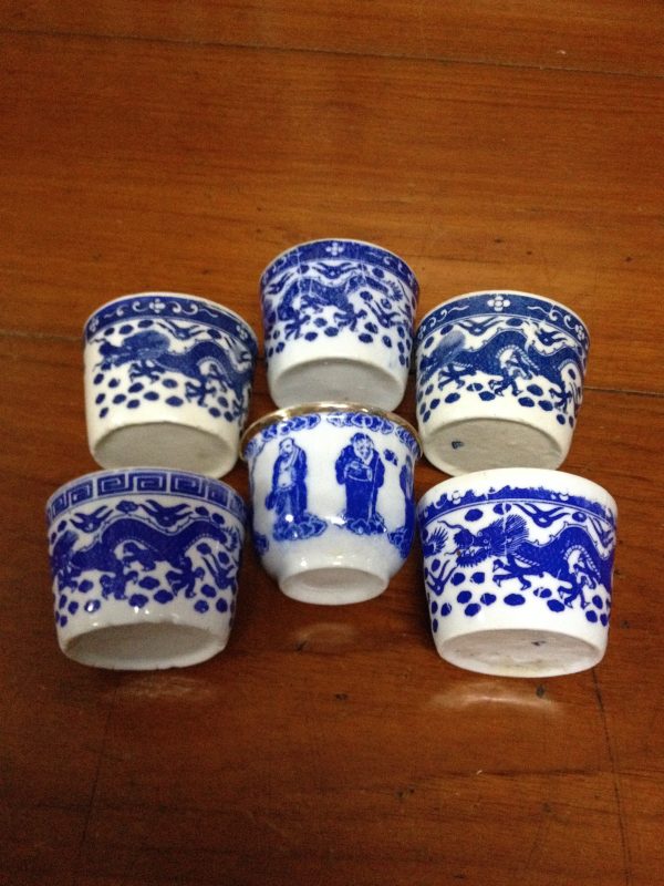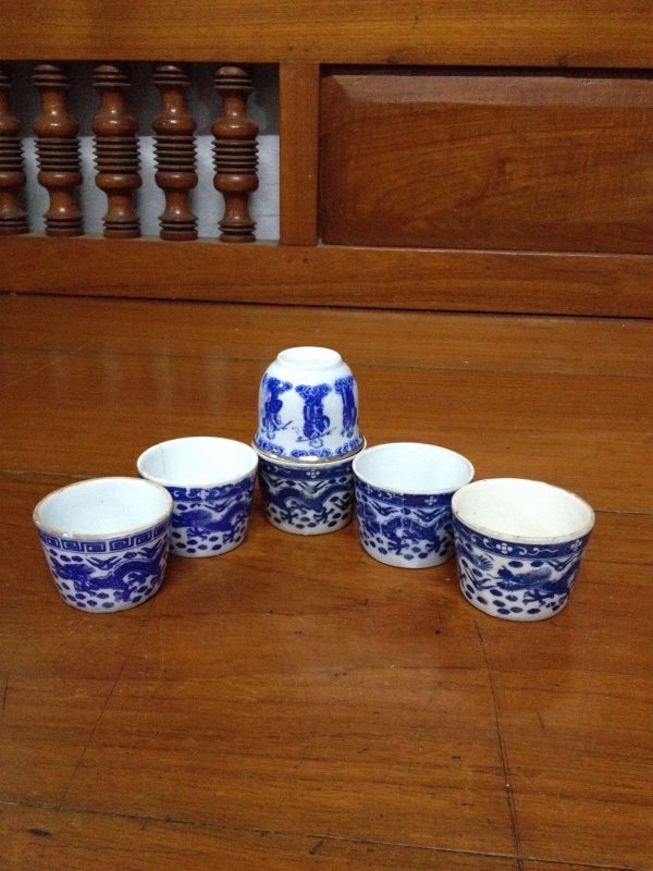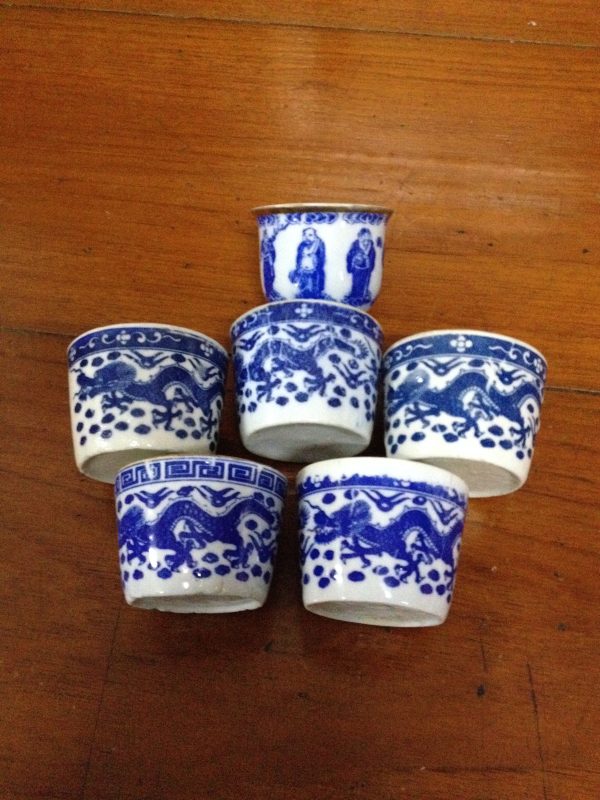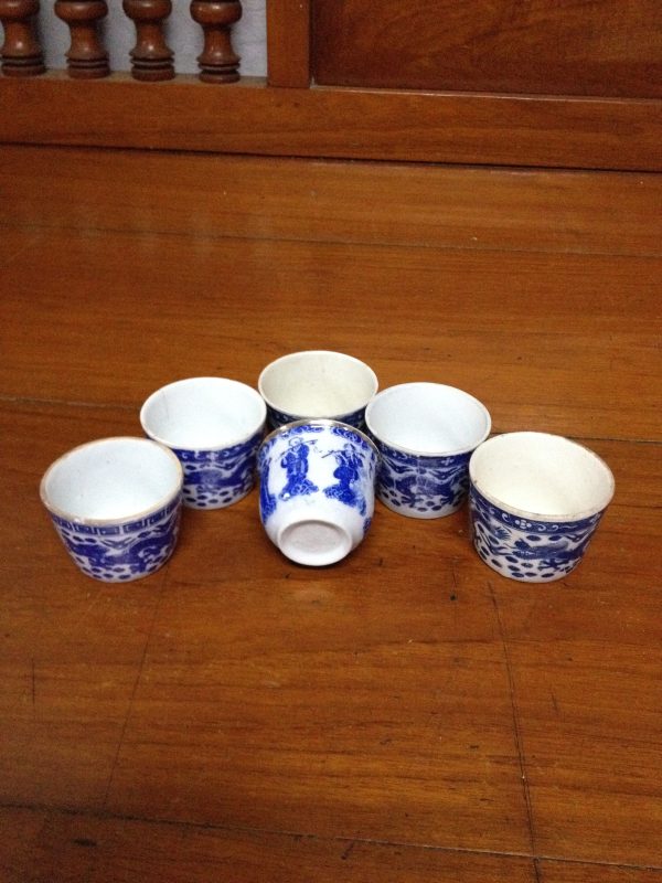 ถ้วยน้ำชากังใสเนื้อแกร่งโบราณขาวฟ้าลายมังกร ใบใหญ่